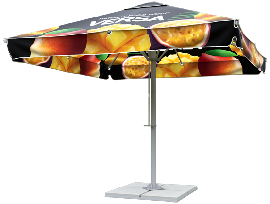 Конструкция зонта – телескопическая. Благодаря такой конструкции купол зонта складываясь, уходит вверх на 1,15 м, спицы зонта не опускаются ниже 1,7 м от земли и т.о. под сложенным зонтом остается свободное пространство для столов и посетителей, а также тент остается чистым в дождливую погоду.